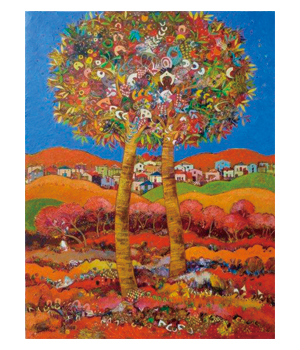 ラリューが最も好きな主題は樹木。人間が生き続け、幸福でいられるための植物の存在価値、その根に対する再認識を深く描き出します。彼の心に浮かびあがってくるフォルムを重ねながら、複雑で陽気な構造を画面に作り上げ、そこに多文化で普遍的かつ色彩豊かなシーニュを載せる。激しく奇妙な彼の絵画言語で、不思議な四角形、丸、三角、鳥、蝶、人物が現れる風景をキャンバスに描き、夢の中にいるようなイマジネーション溢れる音楽的なリズムに乗せて、不思議な世界へと我々を導く扉を開くのです。